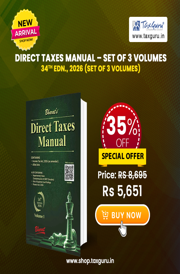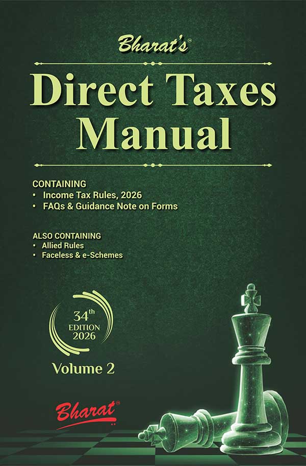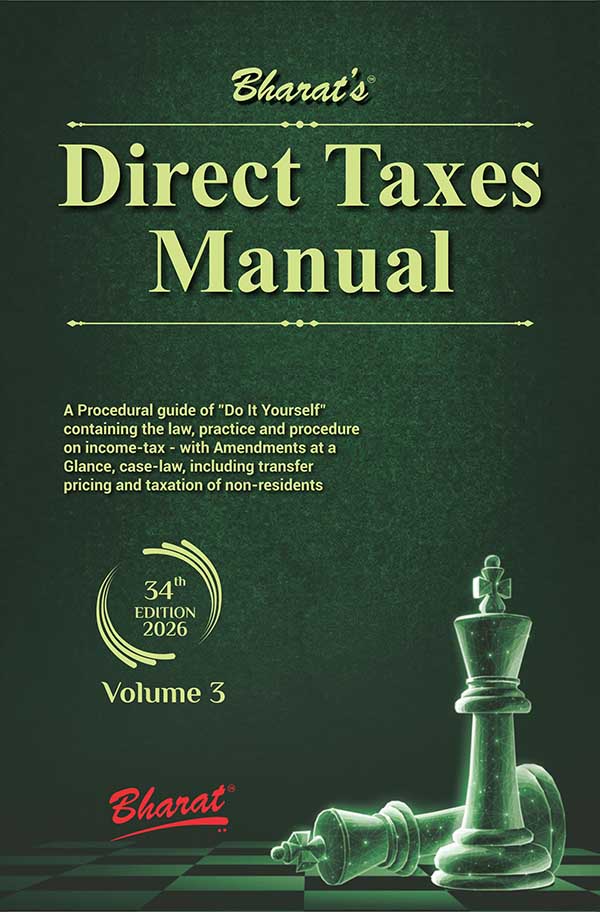Get the latest ‘Direct Taxes Manual – Set of 3 Volumes’ (34th Edition, 2026) by Bharat’s, published by Bharat Publishers. This 5038-page comprehensive manual covers all aspects of direct tax laws. Flat 35% discount for a limited time with free shipping. ISBN: 978-93-4777-911-4. Order now!