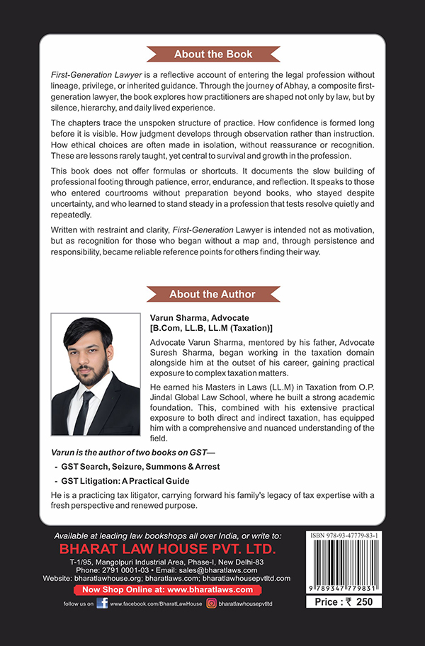 First Generation Lawyer – 1st Edition (2026) is an insightful and motivational book that captures the journey, challenges, and opportunities faced by lawyers who enter the legal profession without a family background in law. Authored by Varun Sharma and published by Bharat Publishers, this book offers practical guidance, real-life experiences, and actionable advice for navigating the legal profession.