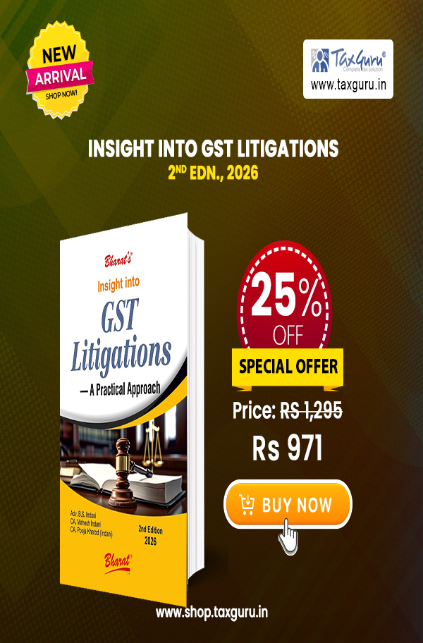 Order “Insight into GST Litigations” (ISBN 978-93-4777-970-1), 2nd edn., 2026, by Adv. B.S. Indani, CA Mahesh Indani, and CA Pooja Khatod (Indani). This 616-page comprehensive guide, published by Bharat Publishers, delves into GST litigation insights and strategies. Available now with a flat 25% discount and free shipping for a limited period!
